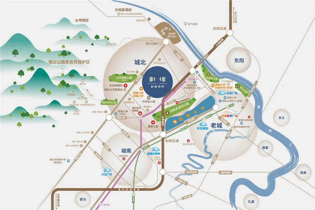 项目简介:新城观博项目体量7万方,建筑面积约5.3万方,由11栋纯洋房社区组成,涵盖花园洋房、跃层,合计504套;建筑面积约87-125㎡望山纯洋房全城预约中。项目地址在北碚城区城北板块西大附小缙云校区旁,背靠缙云山脉,三大主题公园环伺,便捷交通路网约600m(规划中轨道7号线),出门即上内环,成熟社区配套满足日常,商业综合体约5公里吾悦广场、万达广场、天奇广场、嘉陵风情街;小区打造500㎡下沉式庭院园林与一线瀑布呼应,打造新城在北碚迭新的圆梦系。