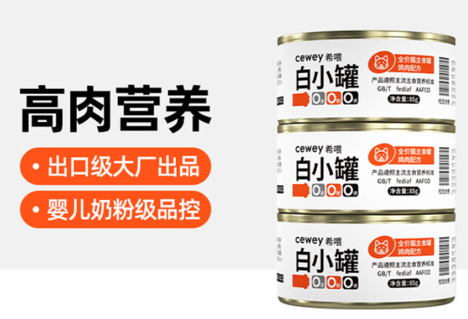 国产主食猫罐头哪个比较好?蛋白质和脂肪是关键营养指标,都是猫咪的能量来源,选罐头要记住两点:一是粗蛋白,(干基)最好≥50%,有些优质主食罐头甚至在60%以上,能给肌肉生长、免疫系统提供充足的养料,对幼猫发育、孕猫或哺乳期猫咪补充营养很有帮助;二是粗脂肪,(干基)建议选10%-20%之间,过低会影响皮毛健康,过高则易导致肥胖,对老年猫来说脏器负担重。