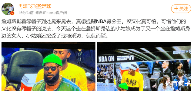 以至于关注足球冉雄飞也能够关注到詹姆斯的穿搭,而且还能发微博嘲讽那些说詹姆斯头戴绿帽子的人,不得不说冉雄飞真的是有意思。也许他也想要借助詹皇这个平台进军篮球圈呢。现在很多人都是靠着詹姆斯的流量为生,无论是国内还是国外都有这样的名嘴。不过作为球迷,还是希望詹皇能够保持健康一直打下去。