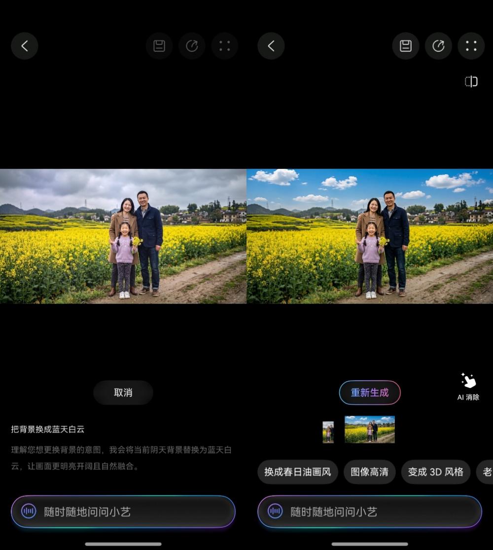 同样,交给小艺修图,轻松搞定。就像官方视频里演示的那样,直接唤起小艺,对TA说:“把背景换成蓝天白云”,瞬间给照片换上明媚的好天气,氛围感有了。