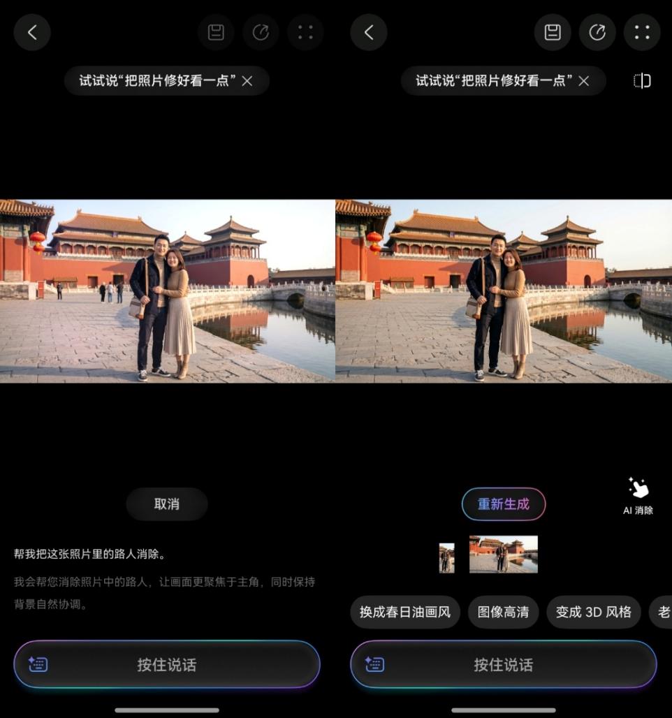 现在真的超级简单,打开手机图库,选中你要修的照片,然后长按底部导航条唤醒小艺,直接跟TA说出需求:“把这张照片里的路人消除掉”。