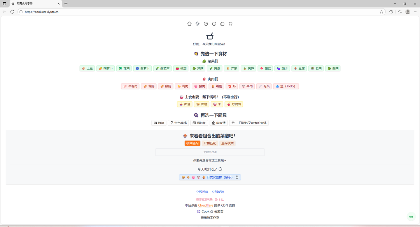 14、隔离食用手册如果你打开冰箱不知道吃什么、不想下馆子或点外卖,这个网站能让你一秒学会做菜。界面简洁,主要分为菜、肉、主食、厨具四大板块,傻瓜式教程一看就会。比如选择土豆(菜)、猪肉(肉),再搭配家里现有的厨具,就能生成无数种组合菜谱,涵盖 600 多道菜。点击心仪菜品,会跳转至对应做菜视频,可跟着视频实操,是烹饪新手的天堂。