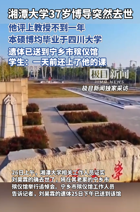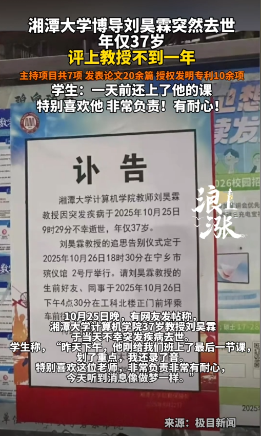 “昨天下午他刚在黑板上圈完 Linux 考点,还笑着说‘期末不难,记牢这些就行’,我录的音还在手机里,今天怎么就没了?”10 月 25 日晚,湘潭大学计算机学院的学生在社交平台上的一句话,让无数人破防 ——37 岁的博士生导师刘昊霖,前一天还站在讲台上给本科生收尾课程,第二天就因突发疾病永远离开了。
