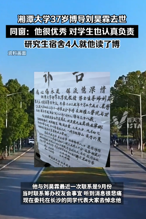 现在湘潭大学计算机学院的官网,已经把刘昊霖的简历页面调成了黑白色,校园公告栏上贴满了学生手写的缅怀卡片:“老师,您划的重点我都背下来了,可您怎么不回来监考了?”“您帮我改的论文,我已经投稿了,等有结果了,我去哪告诉您呀?”