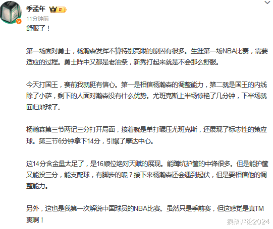 体坛周报记者孟季年表示:第一场面对勇士,杨瀚森发挥不算特别亮眼的原因有很多。生涯第一场NBA比赛,需要适应的过程。勇士阵中又都是老油条,新秀打起来就是不会那么舒服。