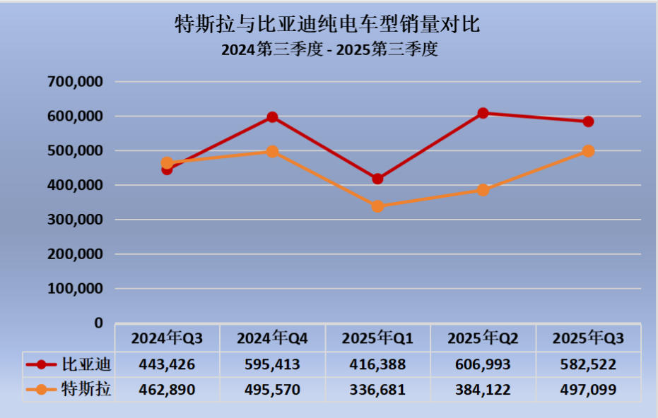 2025 年第三季度全球纯电汽车市场竞争格局尘埃落定,中国新能源汽车龙头企业比亚迪再度以显著优势领先特斯拉,实现连续四个季度销量登顶,成为全球新能源市场当之无愧的领头羊。据比亚迪官方产销快报及特斯拉第三季度季报显示,比亚迪该季度纯电车型销量达 582522 辆,特斯拉同期交付量为 497099 辆,比亚迪单季度领先幅度达 85423 辆。