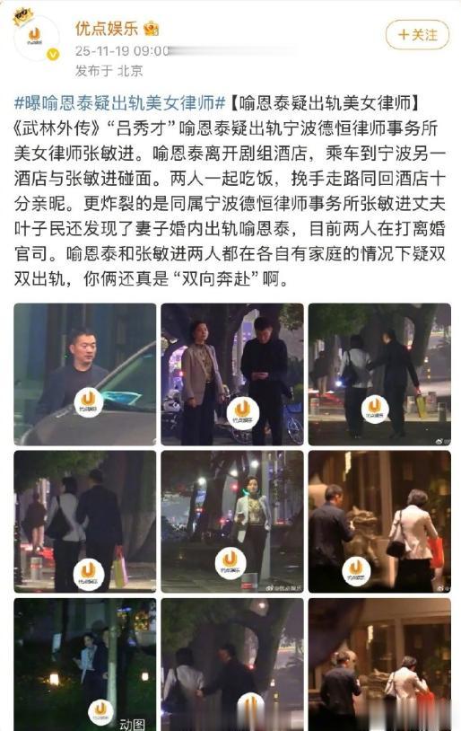 正当大家以为真相大白时,11 月 19 日第三记实锤砸来:媒体拍到喻恩泰与张姓女律师手挽手进酒店,互动亲密,而这位律师当时仍在婚内,其丈夫已提起离婚诉讼。更巧的是,游泳教练的前妻也发文补刀,证实 2022 年就发现史林子与丈夫出轨,自己因此离婚。