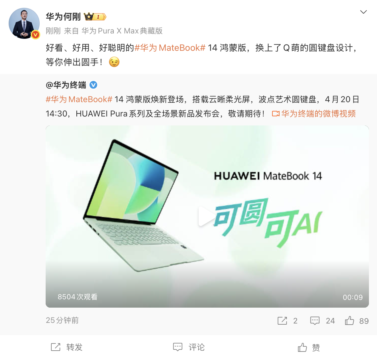 4月14日,华为终端官方微博发布了新品宣传短片,官宣了其PC产品线最新力作——全新鸿蒙电脑华为MateBook