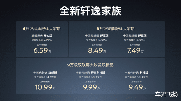 十五代轩逸上市后,与轩逸·经典、十四代轩逸联袂打造全新轩逸家族,满足中国家庭多样化需求。其中,6万买轩逸・经典,品质纯粹,可靠又舒适,安心之选;8万买十四代轩逸,兼顾智能科技与驾乘质感,舒适之选;9万买十五代轩逸,双联屏大沙发双标配,定义智能家轿新高度,智慧之选。对于中国家庭来说“选家轿,必有一款轩逸,适合你!”