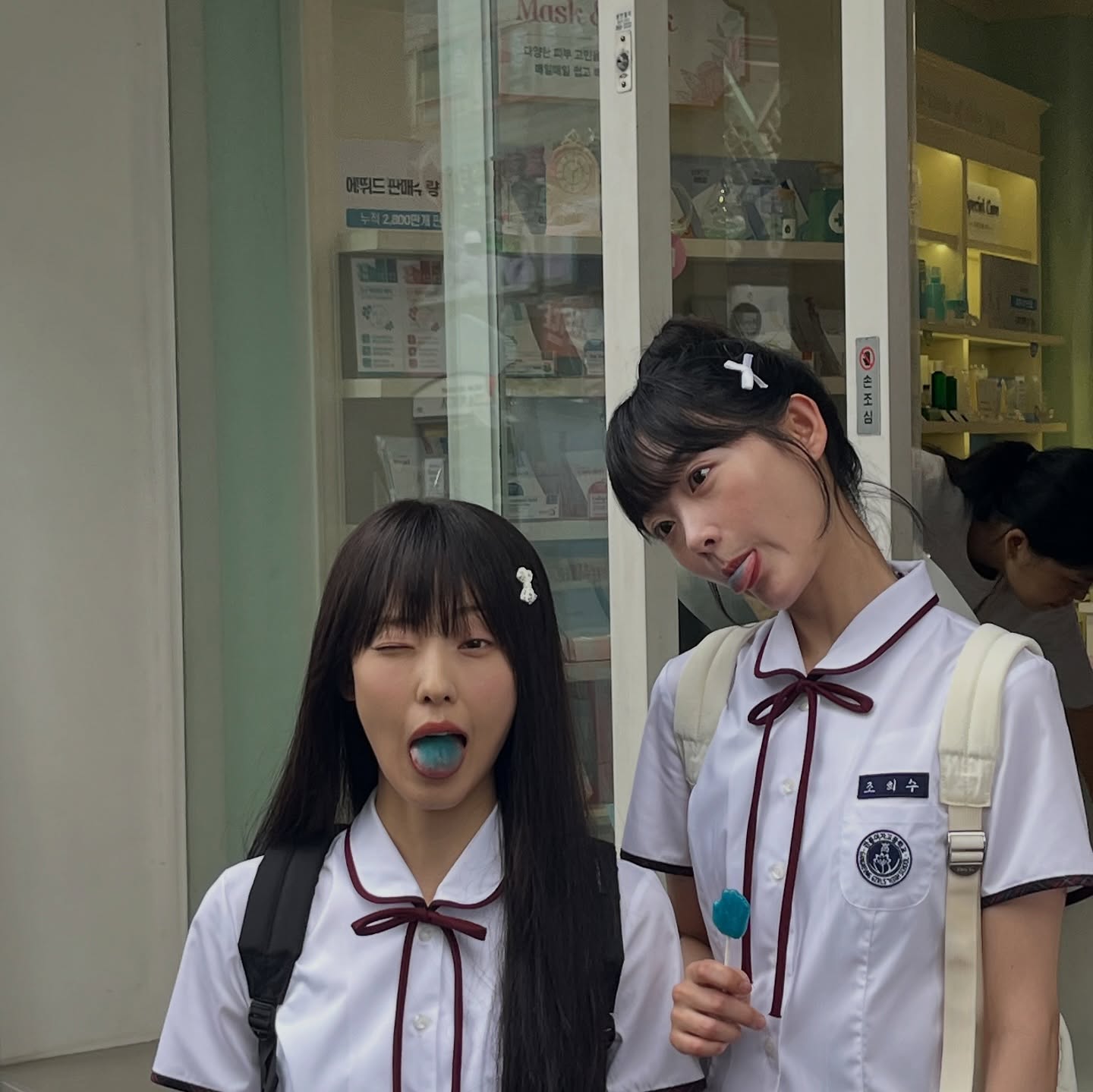 全素妮和李瑜美并肩拿着糖果,带着调皮表情自拍的样子,让人沉浸于剧中学生时代最亲近的朋友赵恩秀和赵希秀的角色中,展现了剧中的深厚友情在镜头外也得以延续。