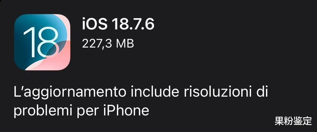 另外苹果还同步推送了 iOS 18.7.6 正式版,这个版本是给不能升级 iOS 26 的设备推送的,主要也是安全性更新。