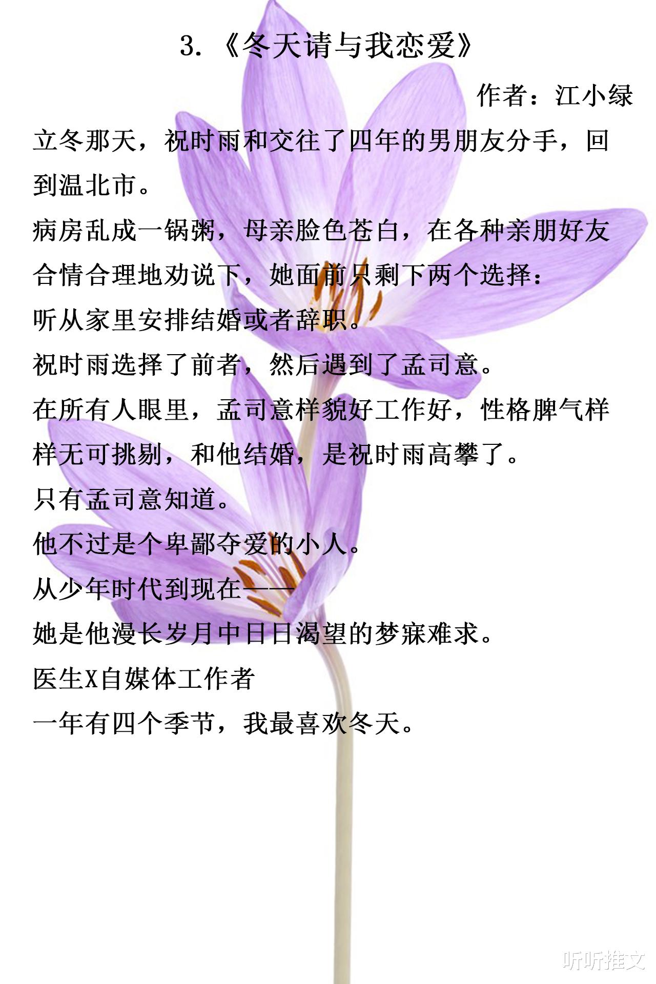 书评:三年前,外科医生程凉和纪录片女导演盛夏相识相爱,然而因程凉的退缩与懦弱让两人的爱情无疾而终。经过三年的磨砺,两人都有了各自的成长,在自己的行业中发光发热。重逢后,依旧相爱的两人打破隔阂,破镜重圆,而程凉也终于学会了与世界和解。故事行文流畅,人物形象生动,男女主相互成就,一个关于爱和成长的故事,整篇故事读起来治愈又不失励志,是一篇不容错过的好文。