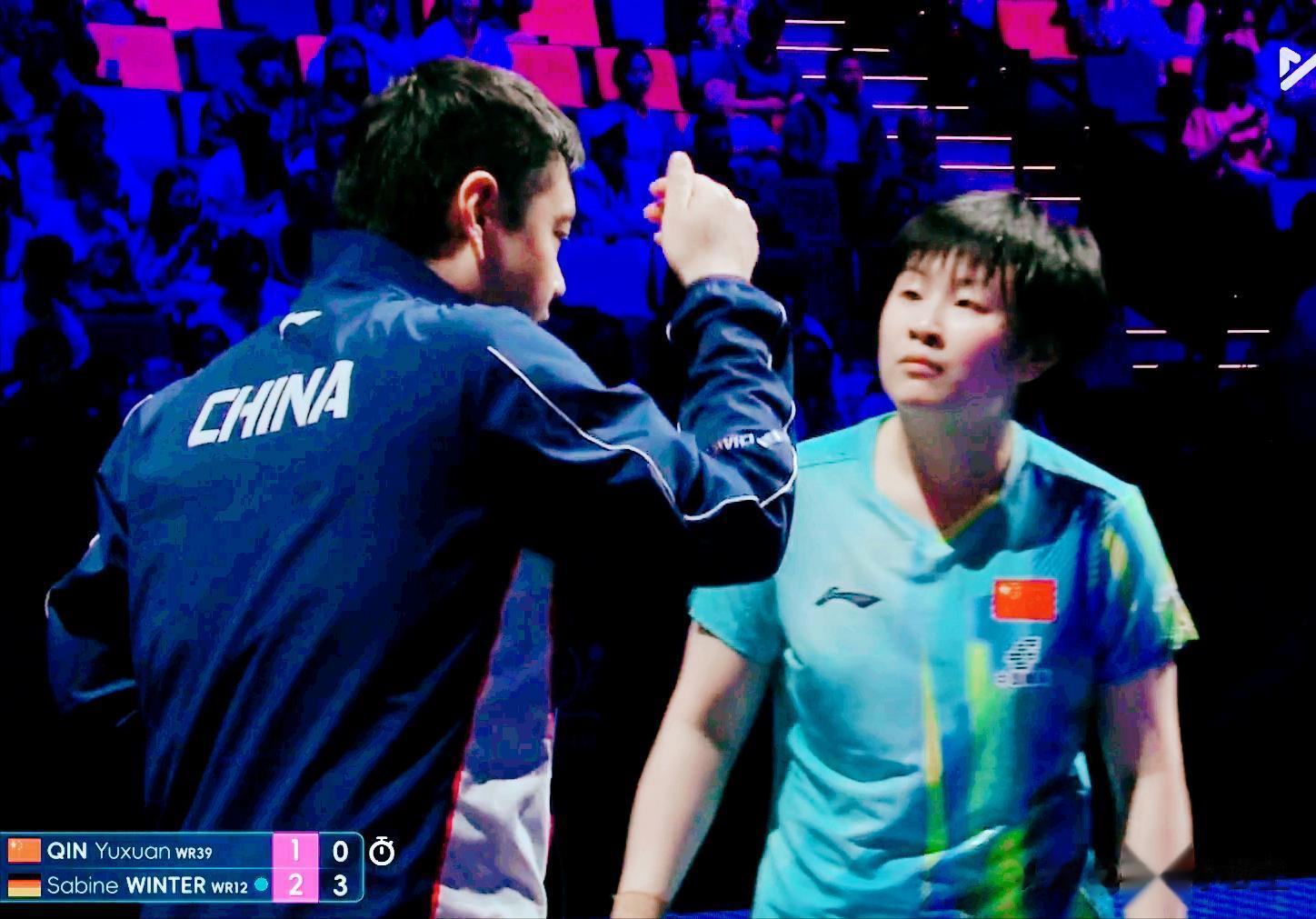 覃予萱1:4温特(11-9,5-11,6-11,6-11,8-11)这场球非常惋惜,覃予萱实力不输温特,第一局坚定执行邱贻可得战术,那就是发正手短,打正手和中间位,11:9拿下。