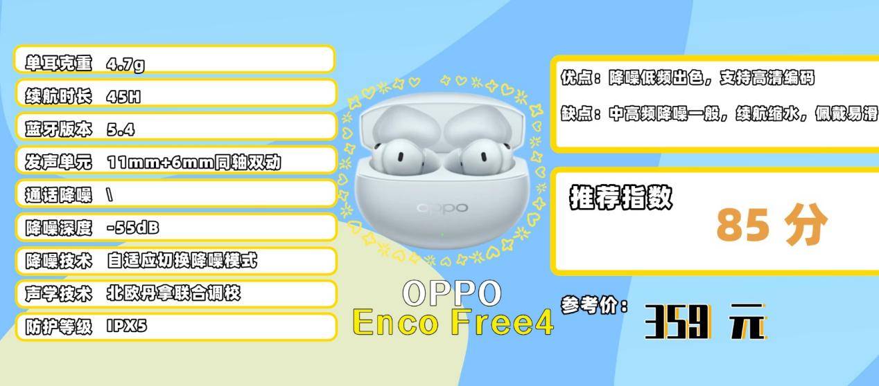 在关闭降噪的情况下,单次续航大约 11 小时;开启 ANC 后能坚持约 6 小时,表现中规中矩。蓝牙连接稳定,多设备切换反应也算灵敏。总体来看,Enco Free4 属于一款在音质、降噪和舒适度上都兼顾得不错的实用型耳机,适合注重日常使用体验的用户。