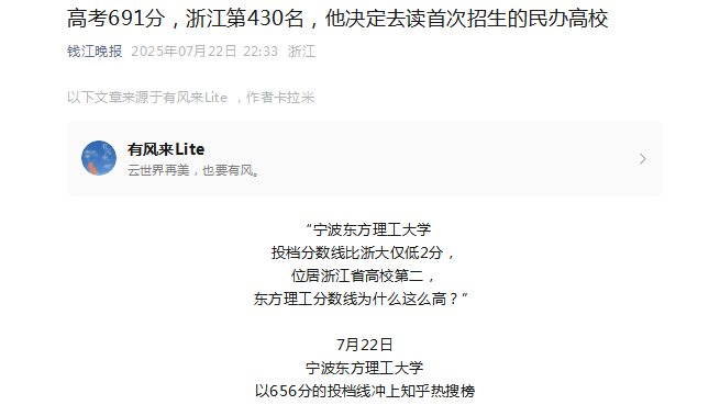 有意思的是,几乎同一时间,浙江慈溪中学考生韩冬煦放弃清华北大、选择宁波东方理工大学的新闻,却被官方媒体大肆报道,甚至成了“教育多元化”的正面案例。