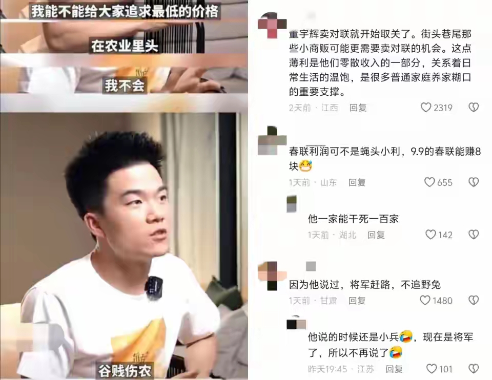 还有冷嘲热讽的声音表示“你一个年营收几百亿的超级直播间,手握顶级流量和供应链,拿货价、售价都有绝对优势,现在居然转头去抢春联这种小本生意?”于是这些对董宇辉卖春联一事觉得不舒服的人,认为董宇辉这是在做“强者与民争利”的事情,并认为他缺少社会责任感。可见这场风波给董宇辉强加的“帽子”可是够大的!