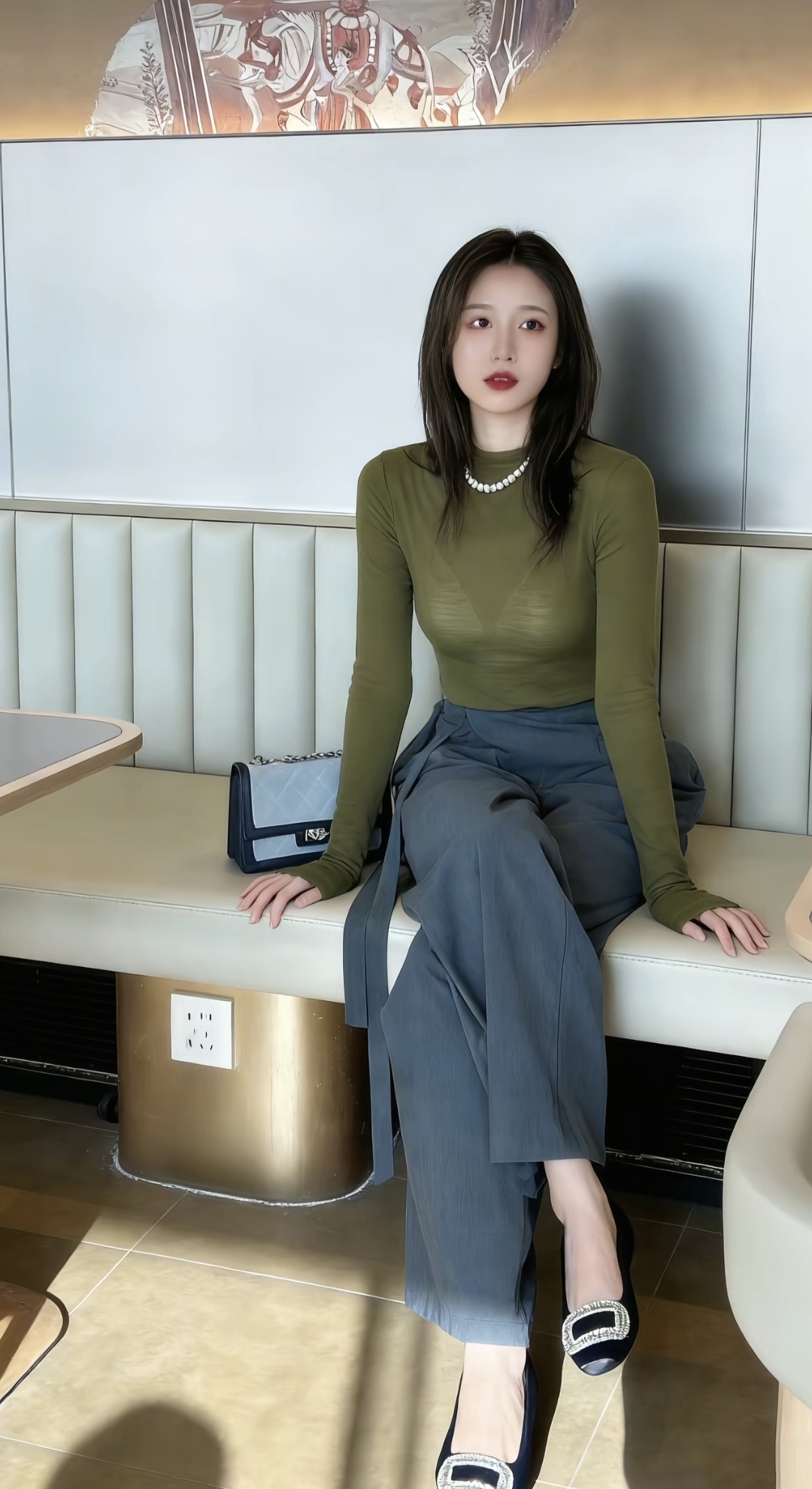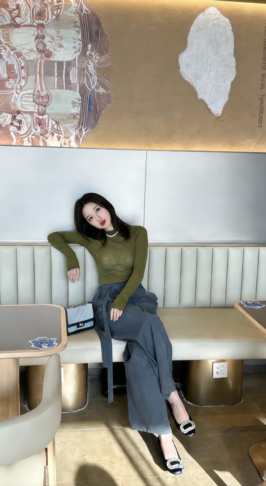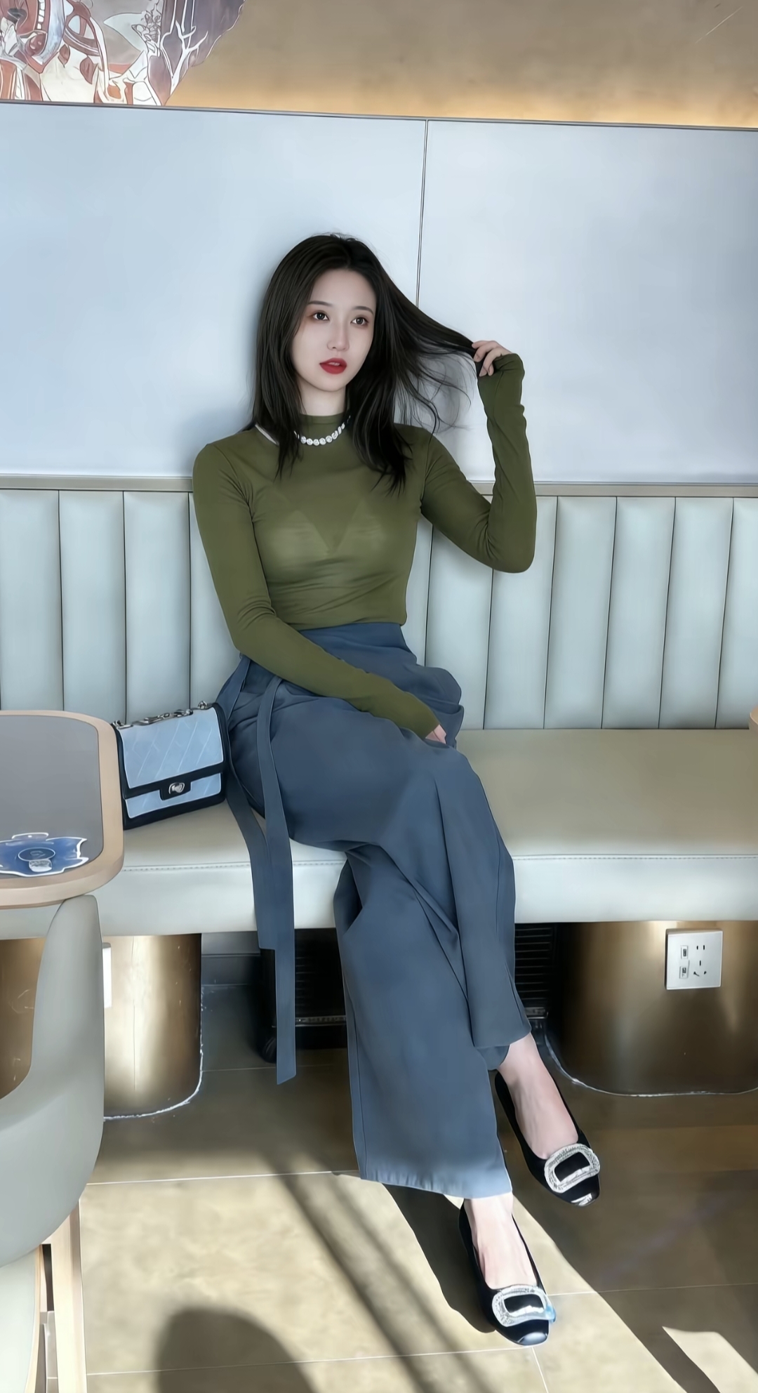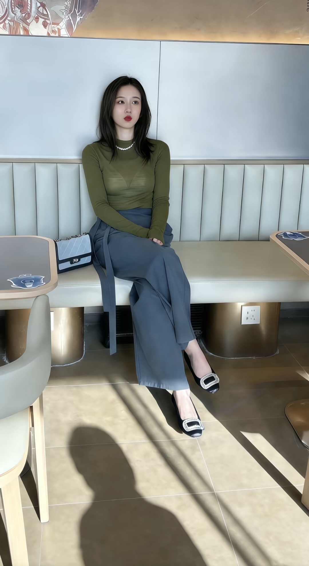 优雅气质,时尚穿搭,咖啡馆里的静谧时光。