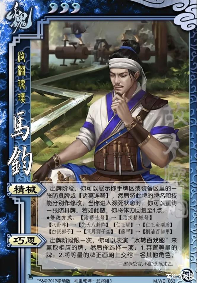 2019年的六月份,是三国杀环境迎来巨变的时刻。这一年上线了彼时最阴间、最超模的武将:马钧。凭借水转百戏的【巧思】,实现了每回合定向五张牌的可怕数值,【巧械】再将拿到的防具进行改装升级,实现过牌、防御数值双离谱程度的高。任何武将能有马钧辅助,立刻强度狂飙十个档位。这位马钧的上线,也被玩家们誉为敲响阴间新纪元前夜的钟声!