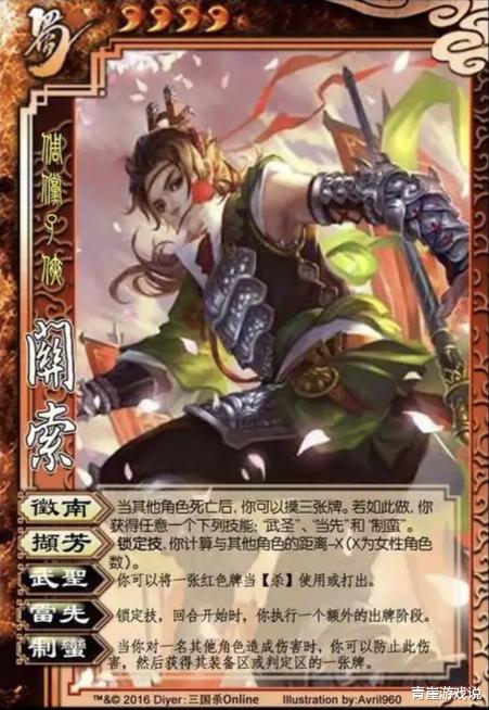 2017年度最强武将必须是关索,虽然前期比较弱,但凭借着【征南】的发育,随着场上死亡角色越多,关索就能一直发育。到后期你会面对一个手里十多张牌、四五个技能的关索,后期关索在那个游戏环境下完全是碾压级的压迫感,此时他便是游戏的BOSS!