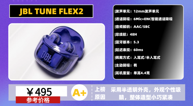 ★这款耳机采用半透明外壳,外观个性吸睛,整体造型小巧紧凑,充电仓也十分便携,日常出门携带无压力。它支持半入耳与入耳式两种佩戴方式,半入耳佩戴轻盈无压迫,长时间使用更舒服;加上耳套就能切换成入耳式,密封性和稳固性更好,嘈杂环境更适用。音质搭载12mm动圈单元,整体偏向动感风格,低频量感扎实、鼓点有力,中频人声位置自然,只是人声和伴奏的分离度不算突出,高频延伸顺滑,听感温和不刺耳。耳机支持自适应主动降噪,搭配多麦阵列,环境降噪与通话清晰度都有不错表现。