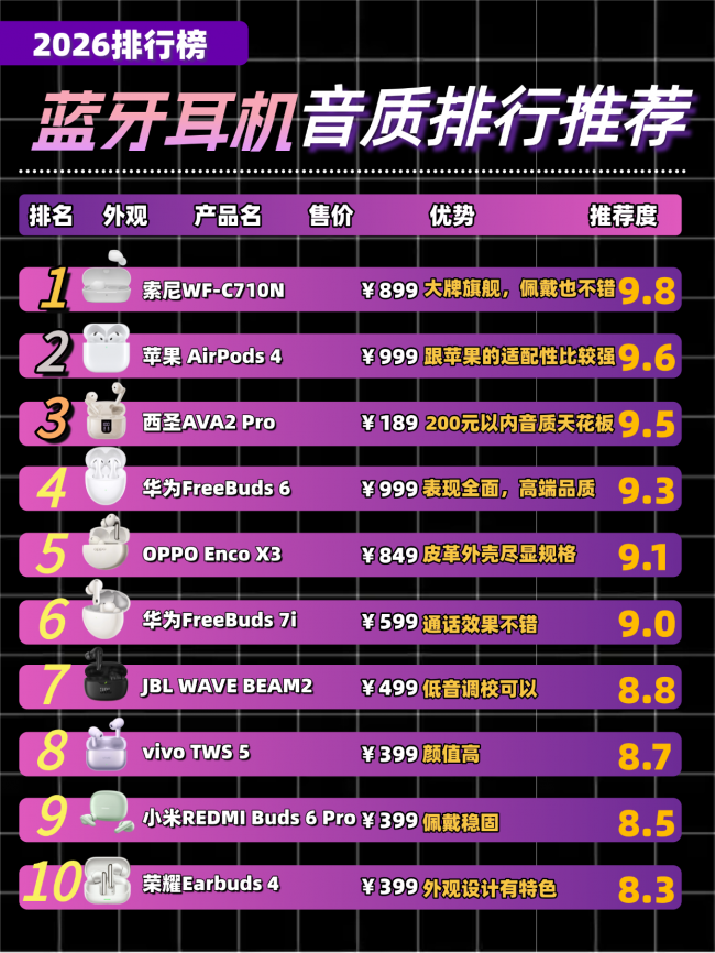蓝牙耳机音质比较好的有哪些品牌?其实不拘什么品牌,“十大100以内公认最好蓝牙耳机排行榜”都不应只是销量堆砌,而是应反映真实体验与长期价值。希望看了今天这份榜单,无论你是数码小白还是影音达人,都能选对一副契合生活习惯的蓝牙耳机,让优质好声音真正“听”进去。