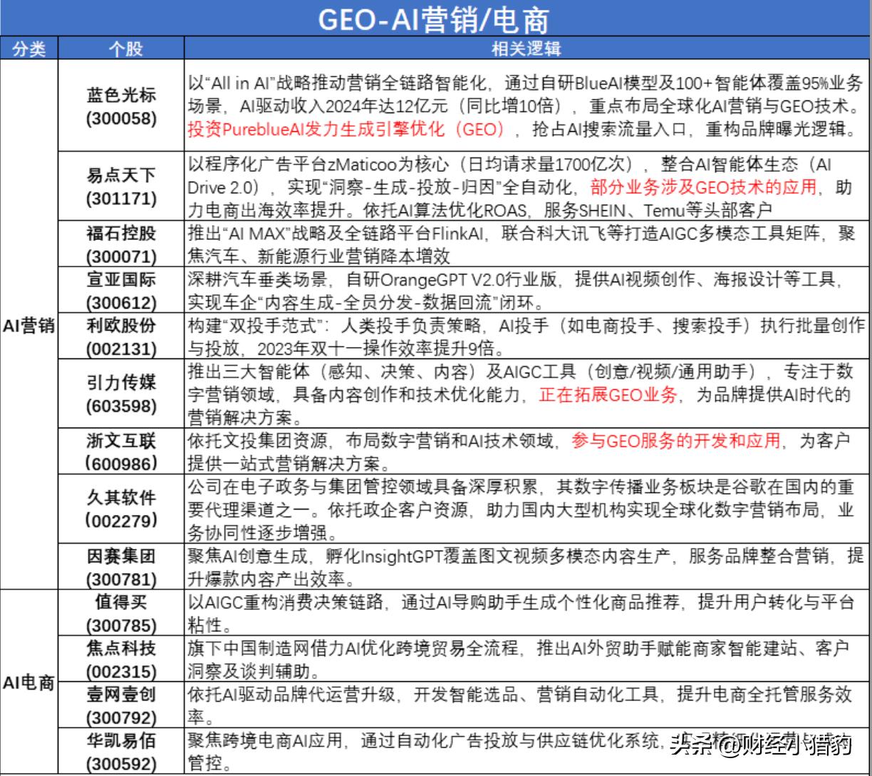 但从目前来看,AI应用板块内走的比较强的一个细分方向是GEO(生成式引擎优化) ,这一个方向或许正在成为AI商业化落地的突破口之一。