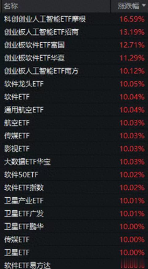 从盘面上看,市场出现了“商业航天+AI应用”的双主线格局,这两个行业内多只ETF产品也触及涨停。