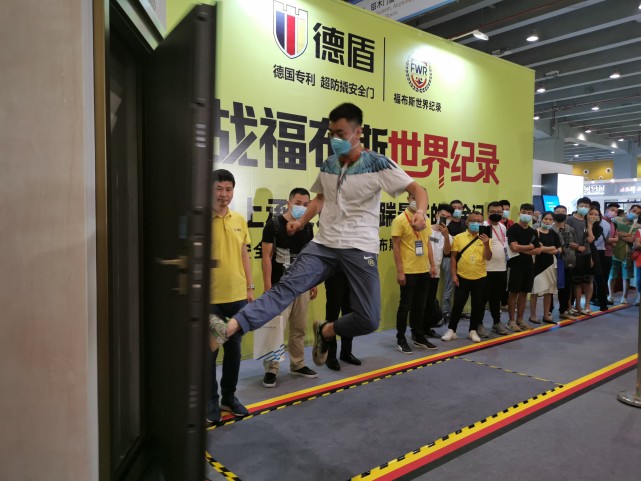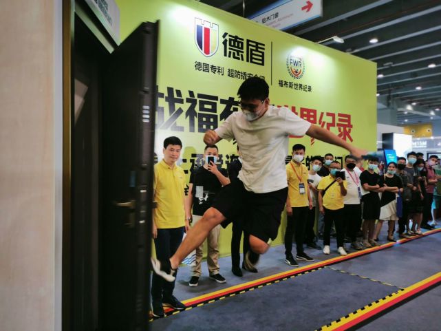 踹门挑战现场气氛热烈非凡,在保证参与人员安全的情况下,在场人员无不跃跃欲试、铆足了劲飞奔并大力踹向德国德盾超防撬安全门。“砰”、“砰”、“砰”踹门声和门伴随着现场的喝彩声,本就热闹的建博会一时之间气氛更为火爆。,最终德盾超防撬安全门新品“乔纳”以连续承踹100次而丝毫无损的佳绩,刷新福布斯世界纪录。