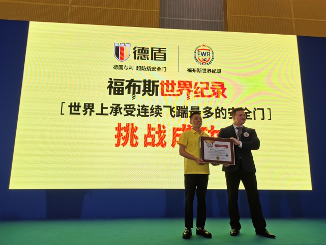 看似简单的踹门,其实可以检验一樘门品质的好坏。飞踹这一动作,首先作用于门体,考验着一樘安全门门体结构和内填充物的品质。其次,飞踹之后门锁碰到门框然后被弹开,考验着门锁和门框结构的稳定性。本次飞踹挑战,福布斯世界纪录认证机构还对每次门体开合做了严格规定,不可大于45度,着实保证了每次踹击的力度。现场也有专家表示,安全门的门锁必定要考虑防技术性开启的问题,要在确保门锁结构精密的同时,保持结构的稳定和坚韧,对设计、材料、制造工艺都是一种考验。再有就是反复承受飞踹,铰链反复开合受力,对其承重能力也是一大考验。敢在众目睽睽之下做出这种挑战,可见德国德盾确实对自己的产品有十分的信心。