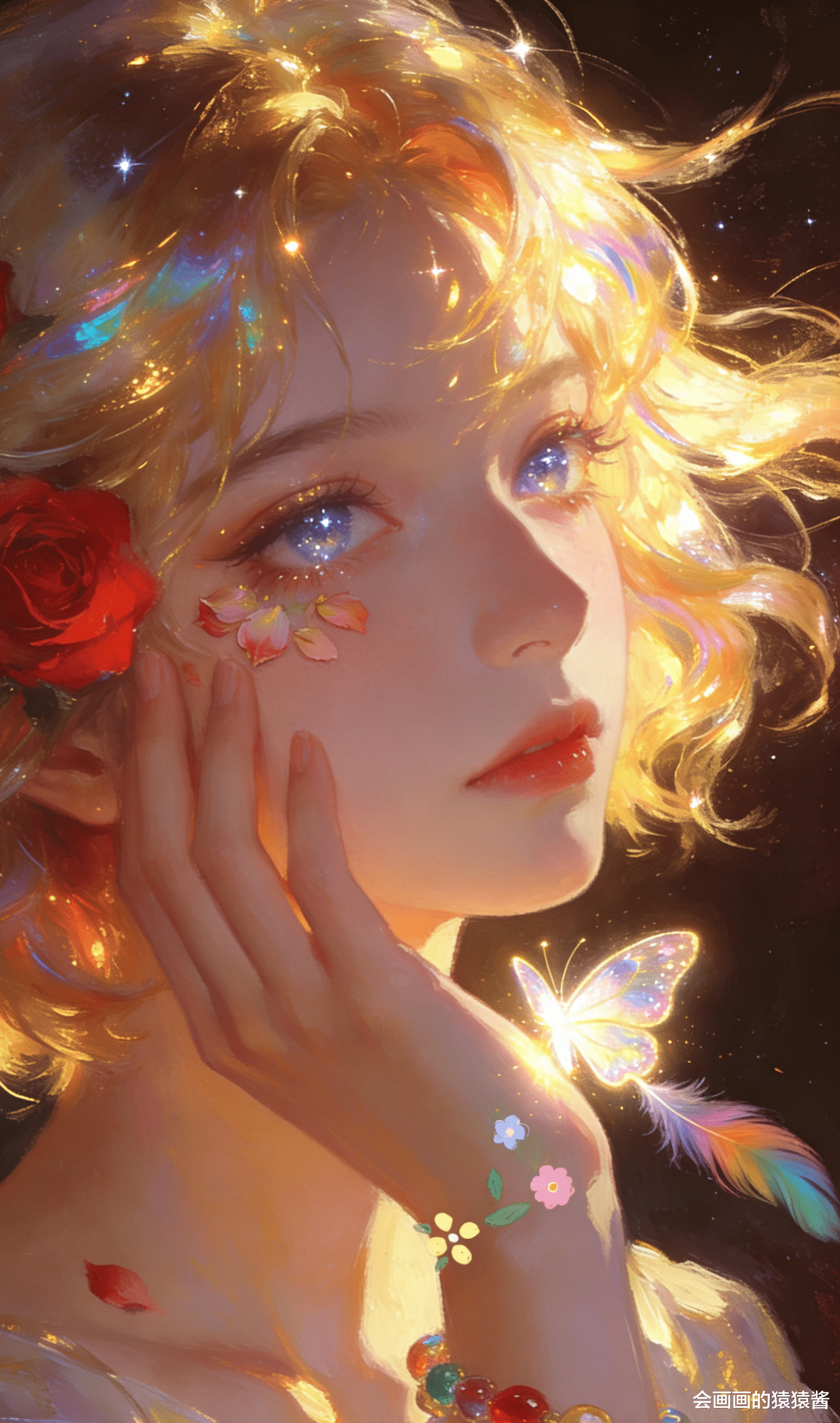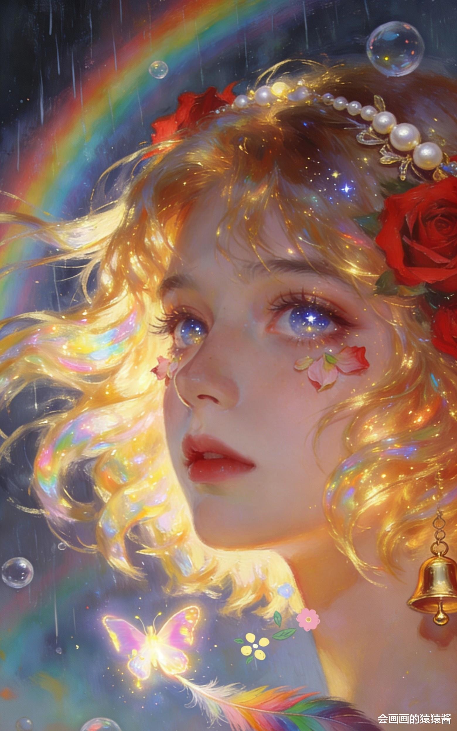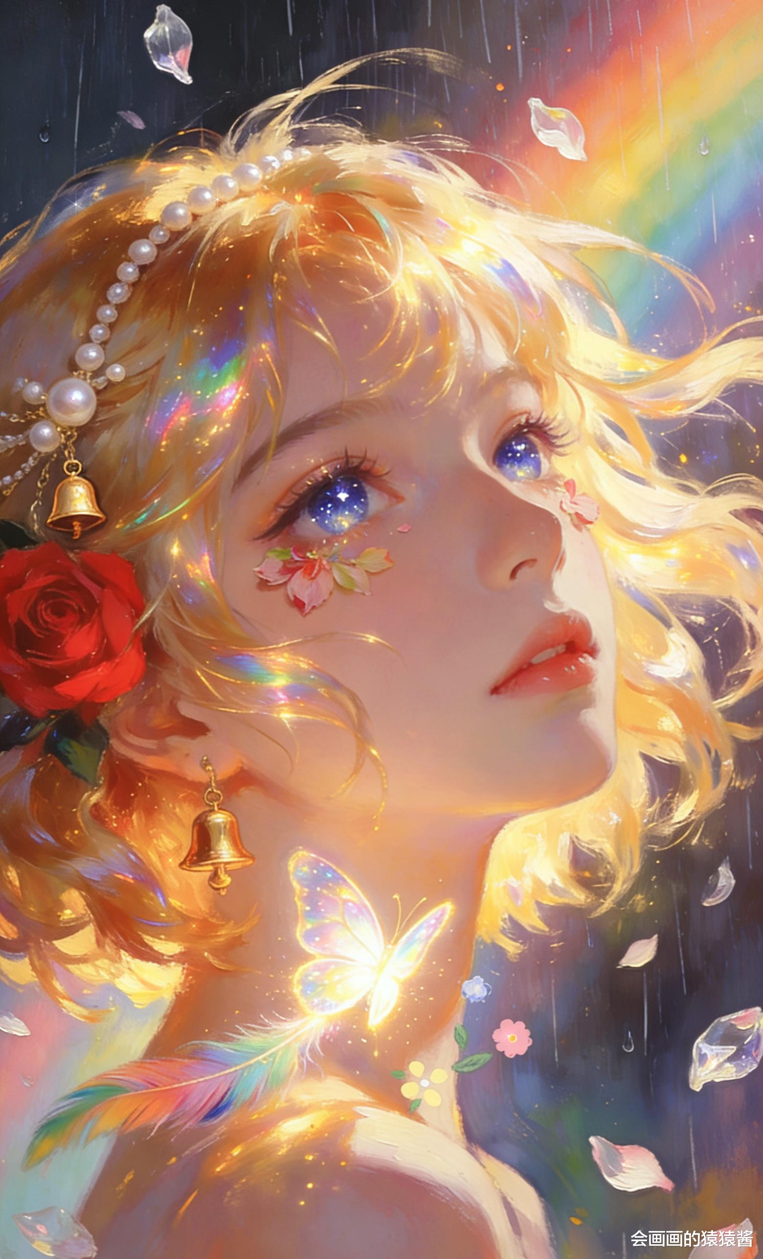 治愈系 少女插画作品,核心是通过光影与细节的精准控制,打造梦幻通透的童话氛围。画面以暖金与蓝紫为基调,金发少女仰首望雨,发丝在光里晕出虹彩光泽,珍珠铃铛发饰与红玫瑰点缀其间,脸颊的花瓣、肩头发光的蝴蝶与飘落的雨丝、花瓣交织,背景的彩虹与细碎星尘让整幅画充满温柔的治愈感。