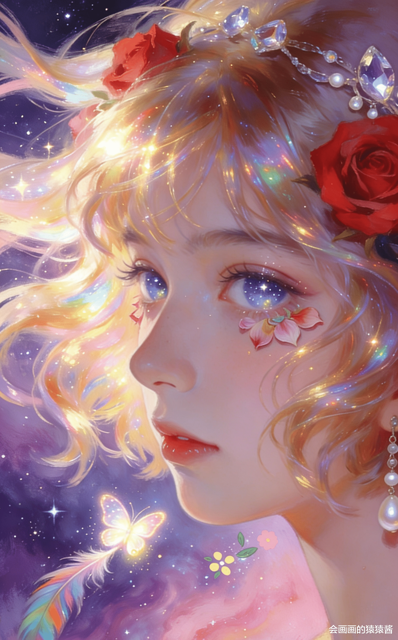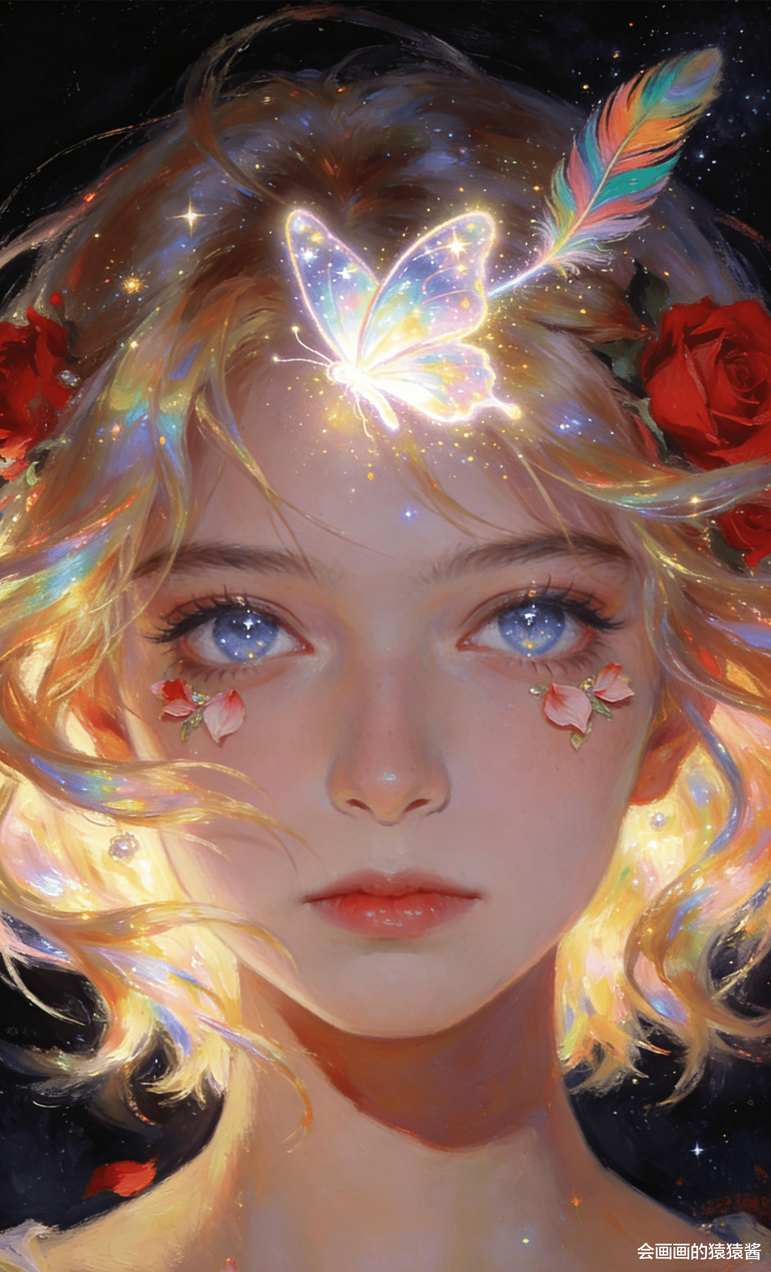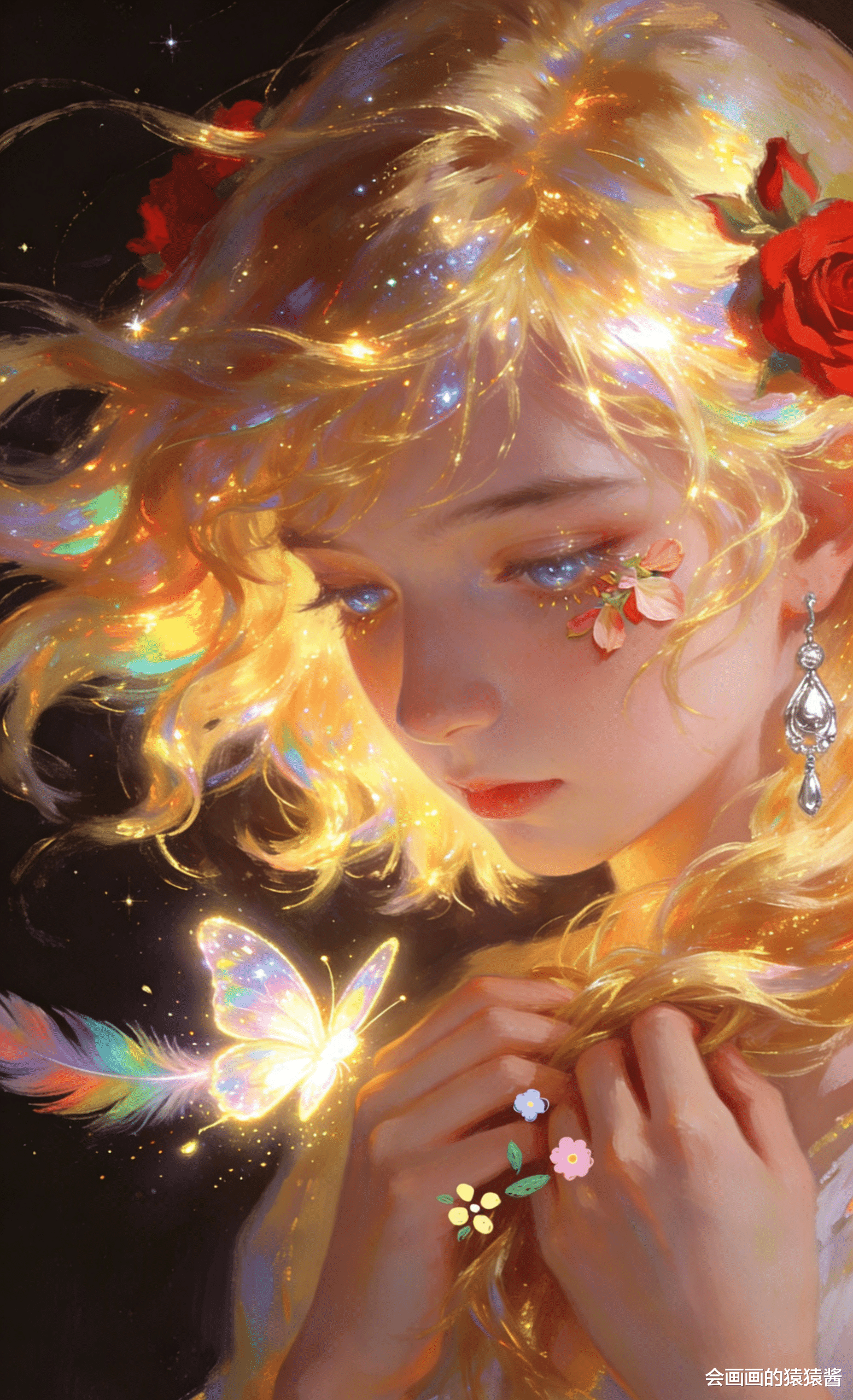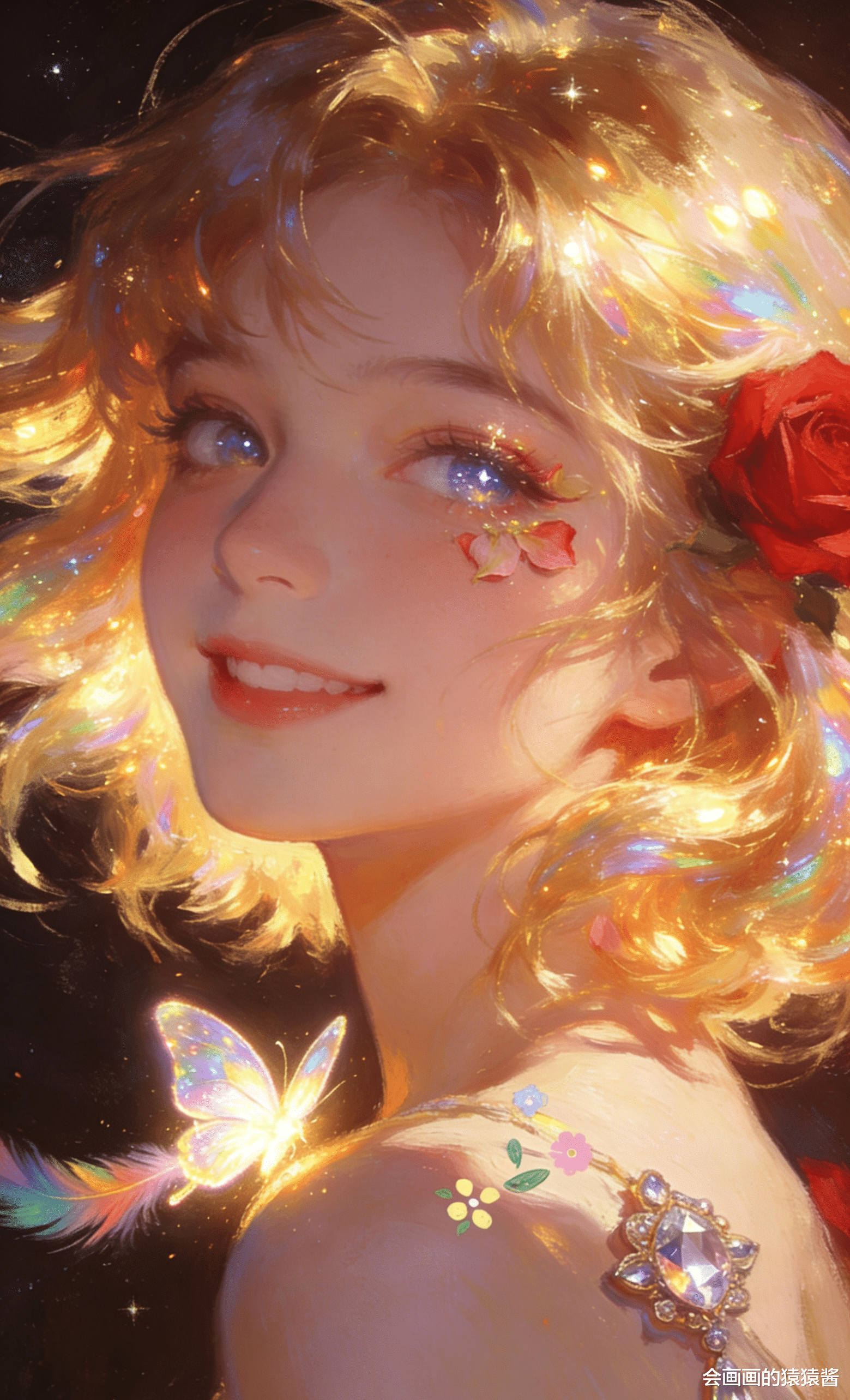 治愈系 少女插画作品,核心是通过光影与细节的精准控制,打造梦幻通透的童话氛围。画面以暖金与蓝紫为基调,金发少女仰首望雨,发丝在光里晕出虹彩光泽,珍珠铃铛发饰与红玫瑰点缀其间,脸颊的花瓣、肩头发光的蝴蝶与飘落的雨丝、花瓣交织,背景的彩虹与细碎星尘让整幅画充满温柔的治愈感。