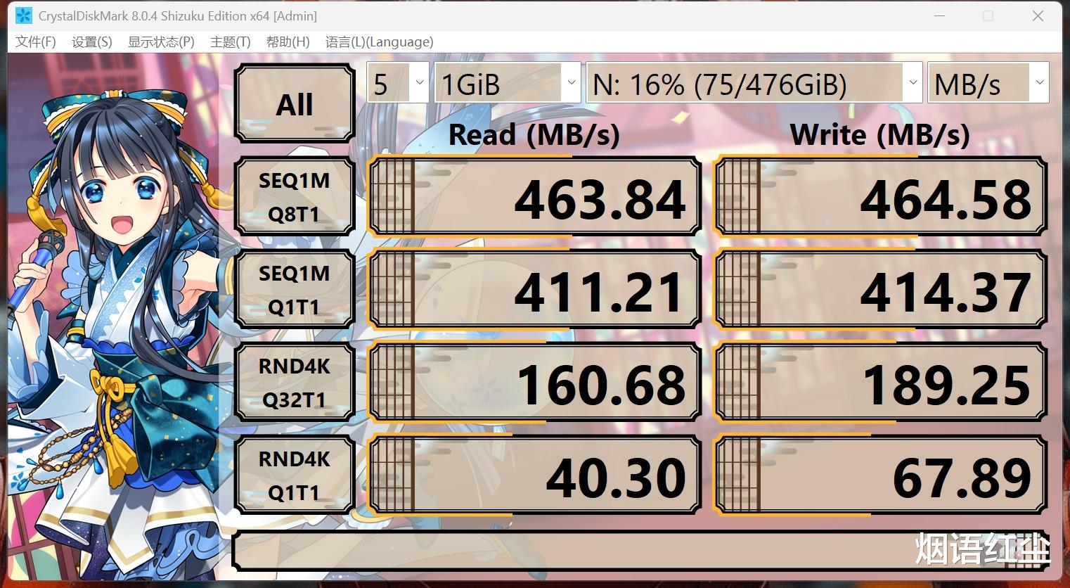 将阿卡西斯双盘位磁盘阵列盒连接到我的电脑前置USB接口,在实际测试中,装入两块NVMe固态硬盘后,使用CrystalDiskMark测得的读取速度可达463.84 MB/s,写入速度也达到464.58MB/s。