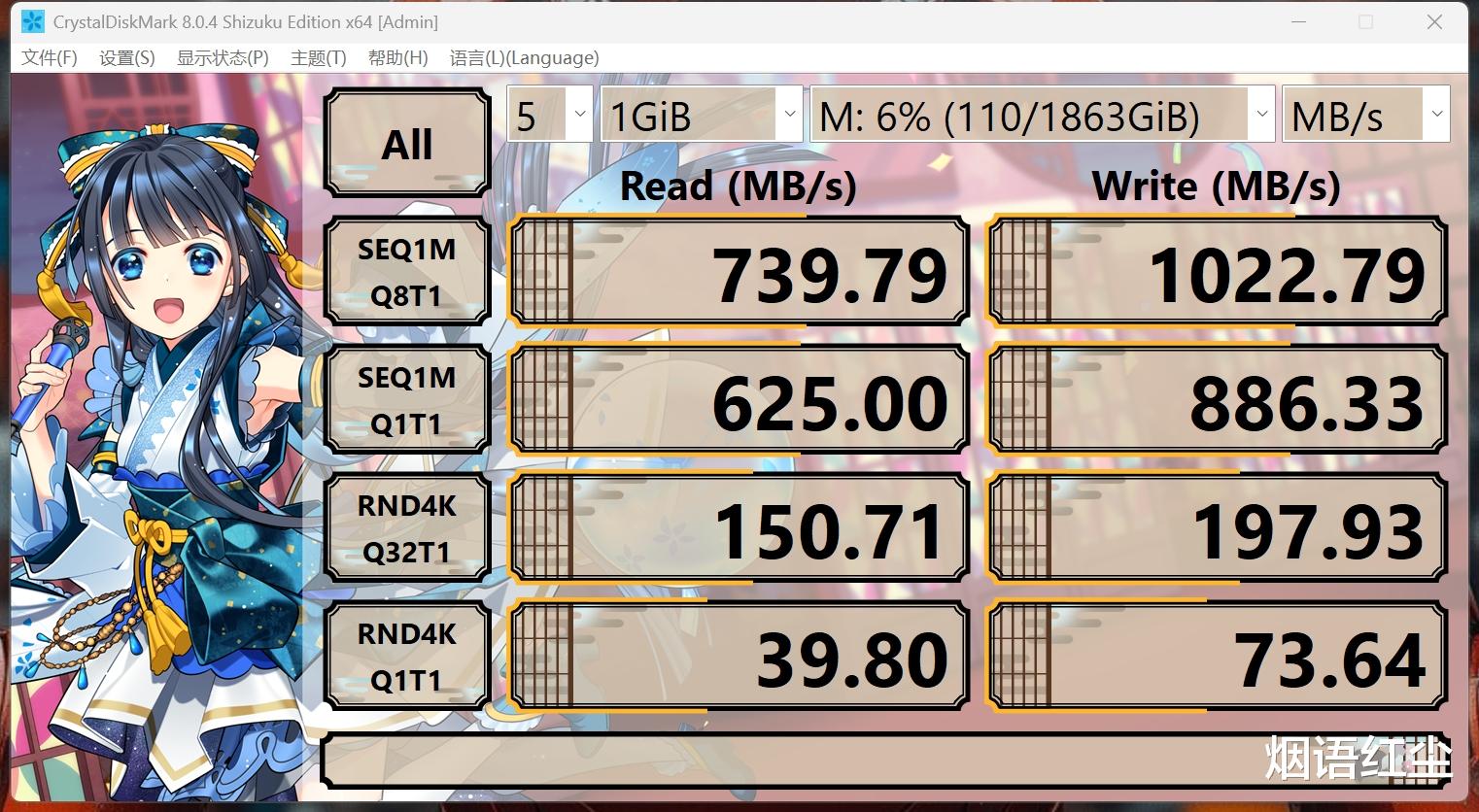 而我将阿卡西斯双盘位磁盘阵列盒通过我原来入手的阿卡西斯16合1扩展坞连接电脑的高速接口后,实际测试中,使用CrystalDiskMark测得的读取速度可达739.79 MB/s,写入速度也达到1022.79MB/s。所以呢,大家在测试一个设备的传输速率时,一定要注意硬盘本身的速率和接口的速率,可能接口不一样,最终的速率就会相差很多。