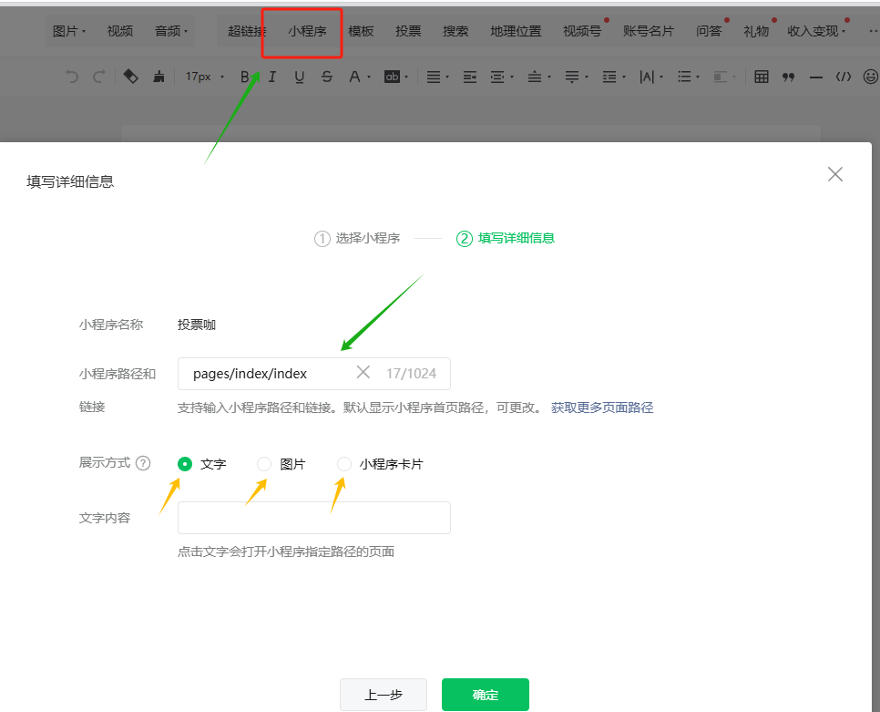 然后放入小程序路径(路径复制方法:活动页面 “管理→公众号” 中的小程序路径复制),可以选择展示方式:文字、图片、小程序卡片任选一个保存即可。