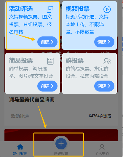 点击首页 大加号“+”发起投票,会跳出好几种投票模版,优先选择“活动评选” 模板,这个模版可以支持99%的投票活动类型,不管是图文 / 视频作品都能匹配。