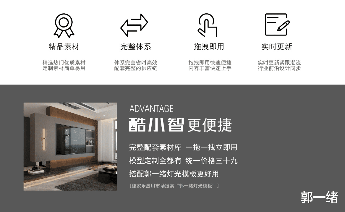 渲染效果是设计方案呈现的核心环节,也是许多设计师的“技术门槛”。酷小智针对性推出智能渲染工具——郭一绪渲染插件,实现灯光LUT深度融合与一键布光——设计师无需掌握专业渲染技巧,只需点击触发,系统便能根据空间属性自动配置灯光参数,生成明暗层次丰富、色彩还原真实的渲染效果。