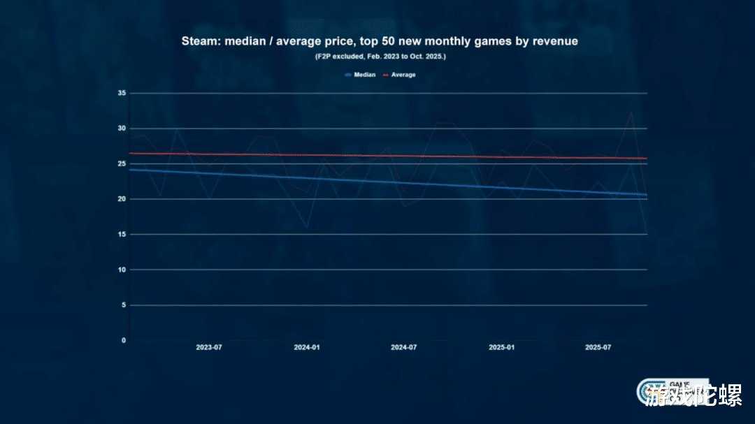 虽然从Steam月度销量前50名的新游平均价格看,2023年2月的21.80美元降至2025年10月的21.41美元,仅下跌了约2%。
