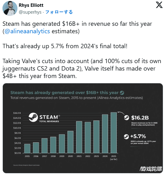 最近,根据游戏市场数据分析公司Alinea Analytics的估计,Steam平台2025年游戏总收入将达到162亿美元,其中超过40亿美元流向了Valve本身。