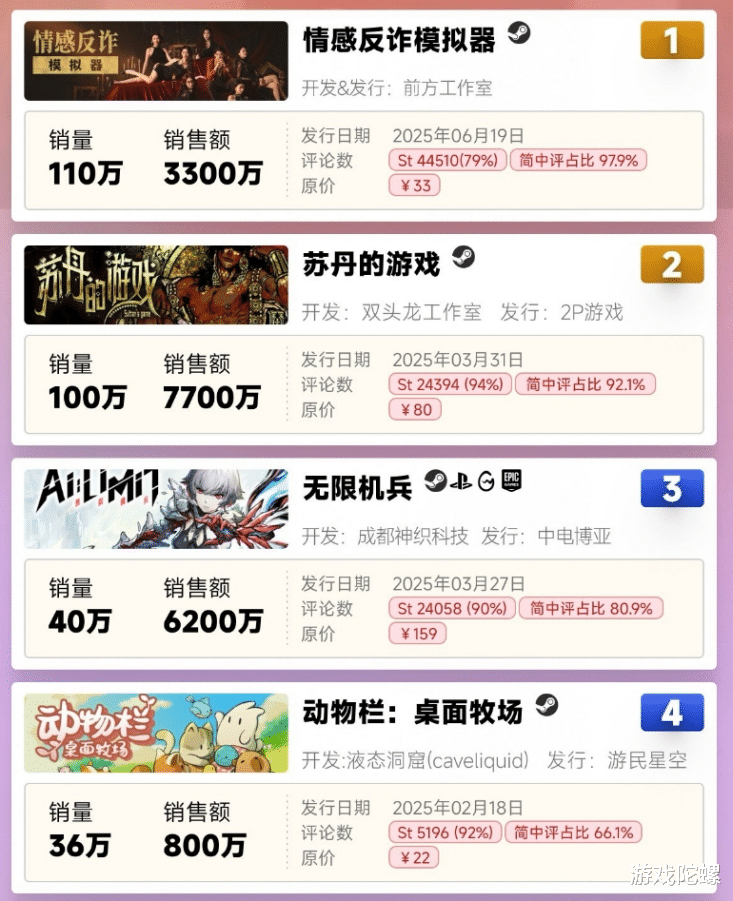 不如回顾一下2025年上半年的国游销量榜,与第四名断层的榜单TOP3正好反应了当前市场定价的趋势。