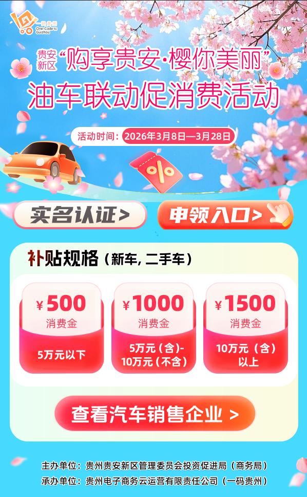 活动明确,2026年3月8日至3月28日期间,贵安新区将出资10万元拨付至“一码贵州”平台。消费者在贵安新区的汽车销售企业每购买一台汽车(新旧均可),可获补贴。车辆价格5万元(不含)以内的,可获得500元补贴;5万元(含)至10万元(不含)的,可获得1000元补贴,10万元(含)以上的,可获得1500元补贴。详细情况,可进入“一码贵州”APP“政府消费券”专区“购享贵安·樱你美丽”活动页面查询。