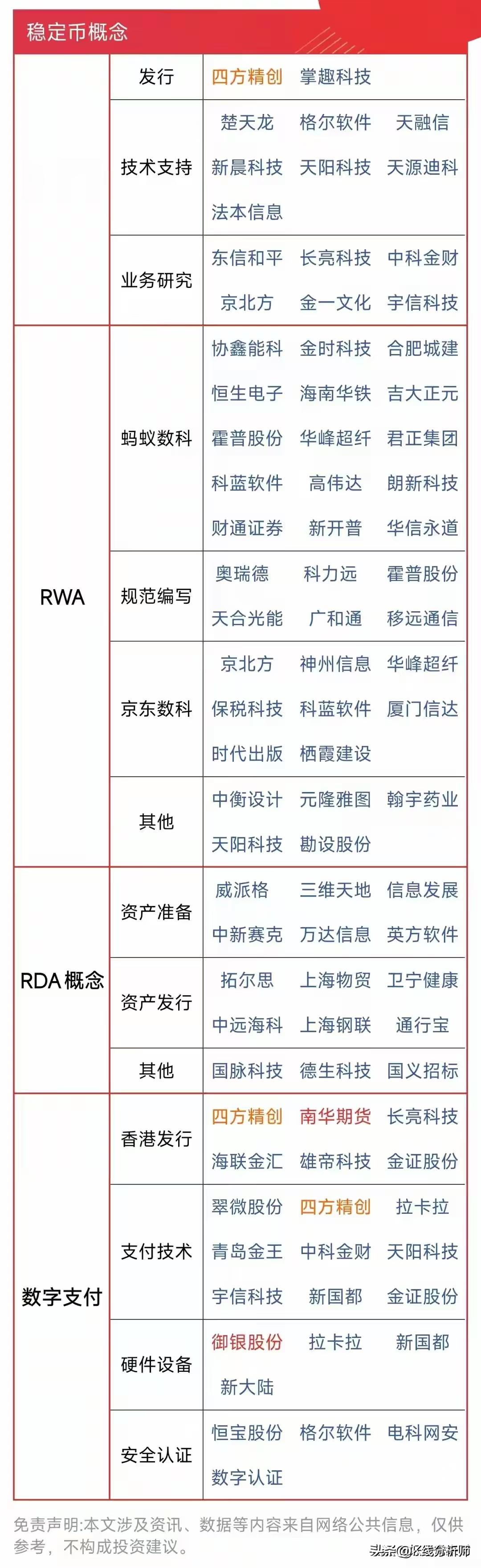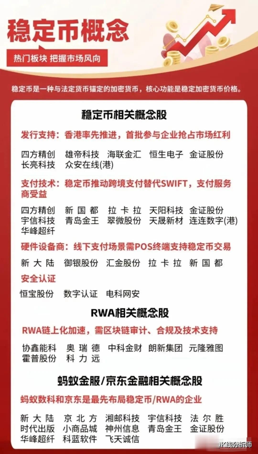 把整个产业链拉通来看,稳定币相关概念股可以分成几个环节:发行支持、支付技术、硬件设备、安全认证、真实资产代币化,还有蚂蚁京东相关的公司。从发币到支付,从硬件到安全,基本覆盖了全链条,翻来翻去也漏不掉什么。