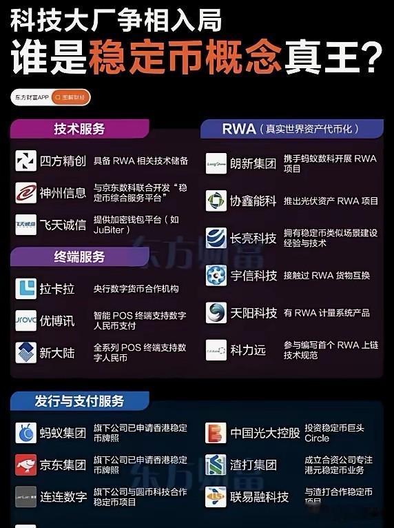 把范围再放大一点,其他科技大厂也在往这条赛道上挤。从业务类型来看,做技术服务的像四方精创、神州信息这些,搞真实世界资产代币化的有朗新集团、协鑫能科,做终端服务的像拉卡拉、优博讯,至于发行和支付服务这块,蚂蚁、京东这些头部企业都在里面。