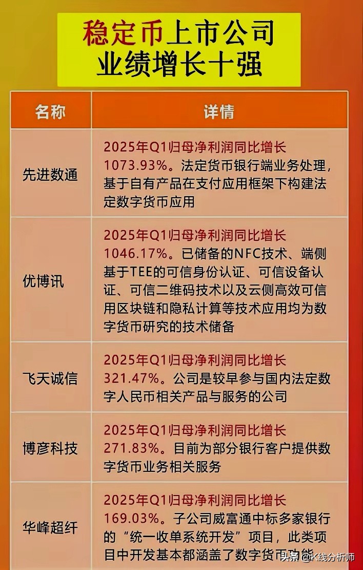 业绩方面,有机构统计了2025年一季度跟稳定币沾边的上市公司净利润增速。先进数通、优博讯涨了十倍以上,飞天诚信、博彦科技、华峰超纤也都涨了超过150%。