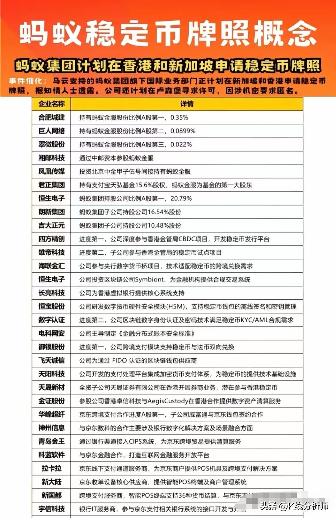 先说蚂蚁集团这边。蚂蚁在香港和新加坡都在申请稳定币牌照,有几家A股公司跟着沾光。合肥城建和巨人网络是直接参股蚂蚁金服的,恒生电子、朗新集团是蚂蚁直接持股的。另外像四方精创、雄帝科技这些公司,参与了香港金管局的稳定币试点,做的是技术适配方面的工作。从参股到持股再到技术服务,算是一条链上的不同环节。