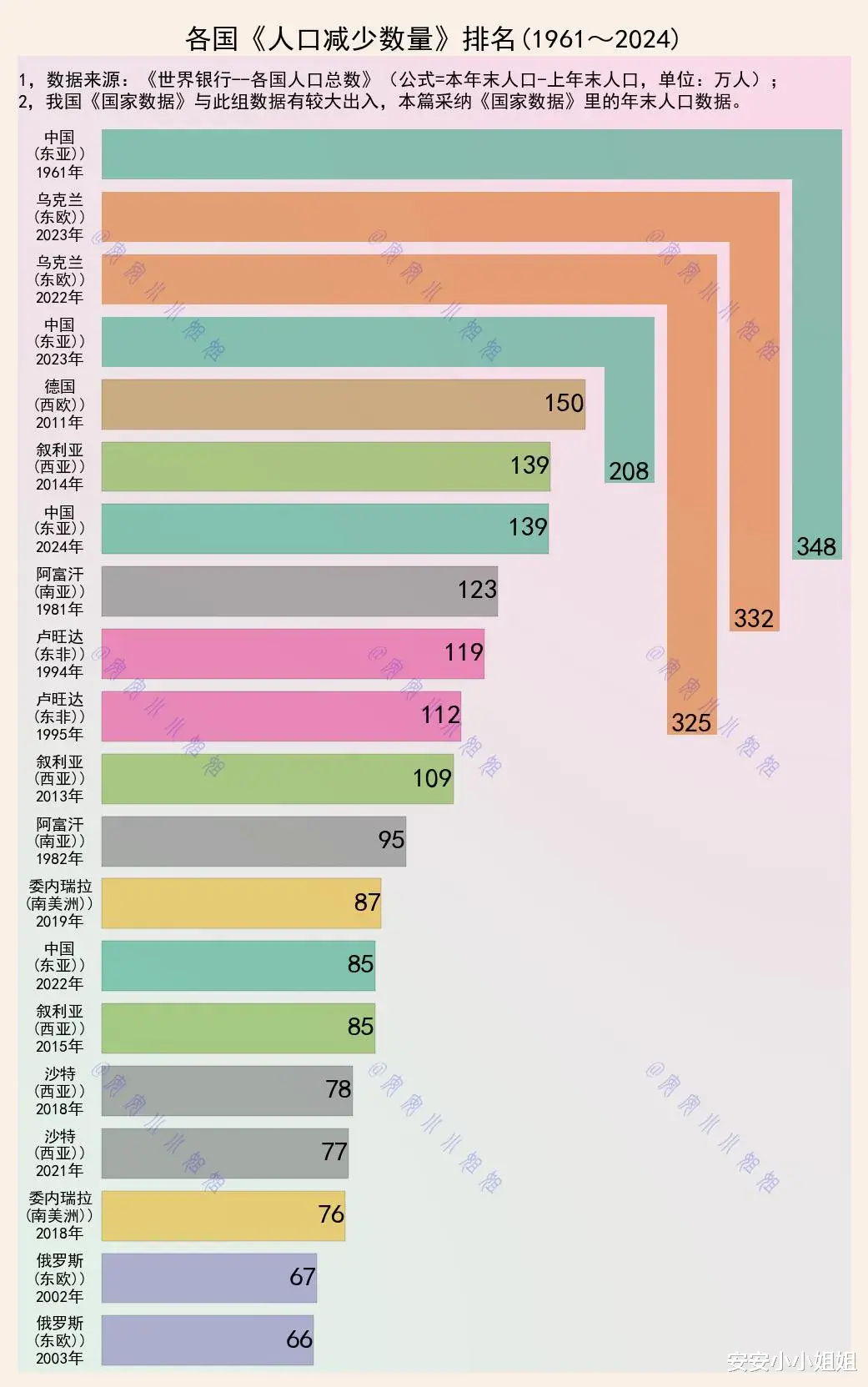 图表中最突出的条形属于中国——1961年的人口减少接近350万人,这是统计期内全球最大规模的年度人口减少。