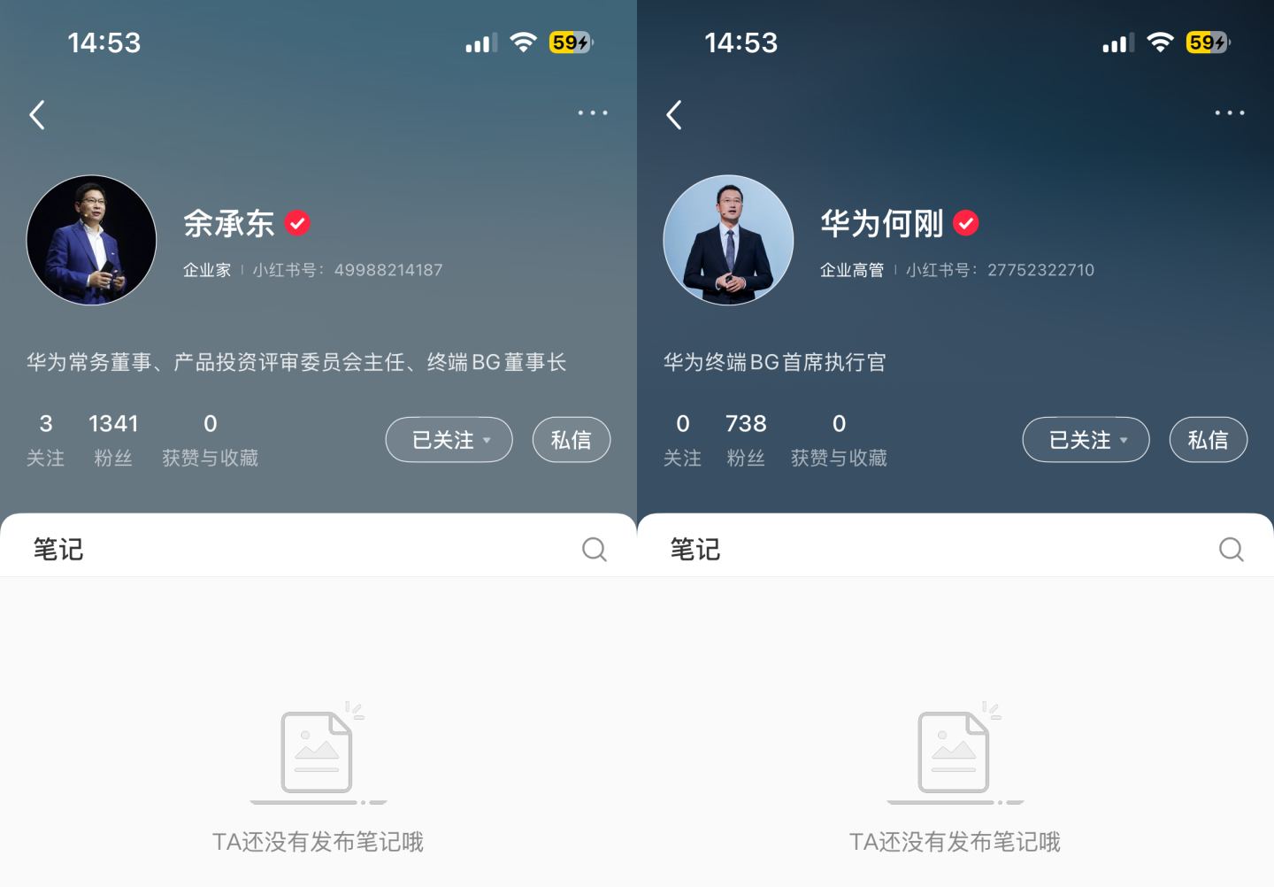 PChome 4月9日消息,华为终端两大业务高管——华为常务董事、终端BG董事长余承东和华为终端BG首席执行官何刚正式入驻小红书平台。此举标志着华为终端最高管理层首次集体进驻该生活方式社区。截至发稿,余承东和何刚粉丝分别为1341个和738个,此二者均未发布内容。