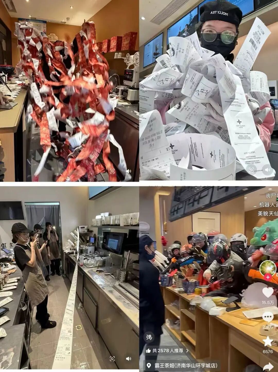 在社交媒体上,不少人发来奶茶店现场混乱的视频:柜台前挤满了催单的外卖员,店员摇奶茶的手变成了无情机械臂,而里面的打单机还在疯狂地吐出单子。