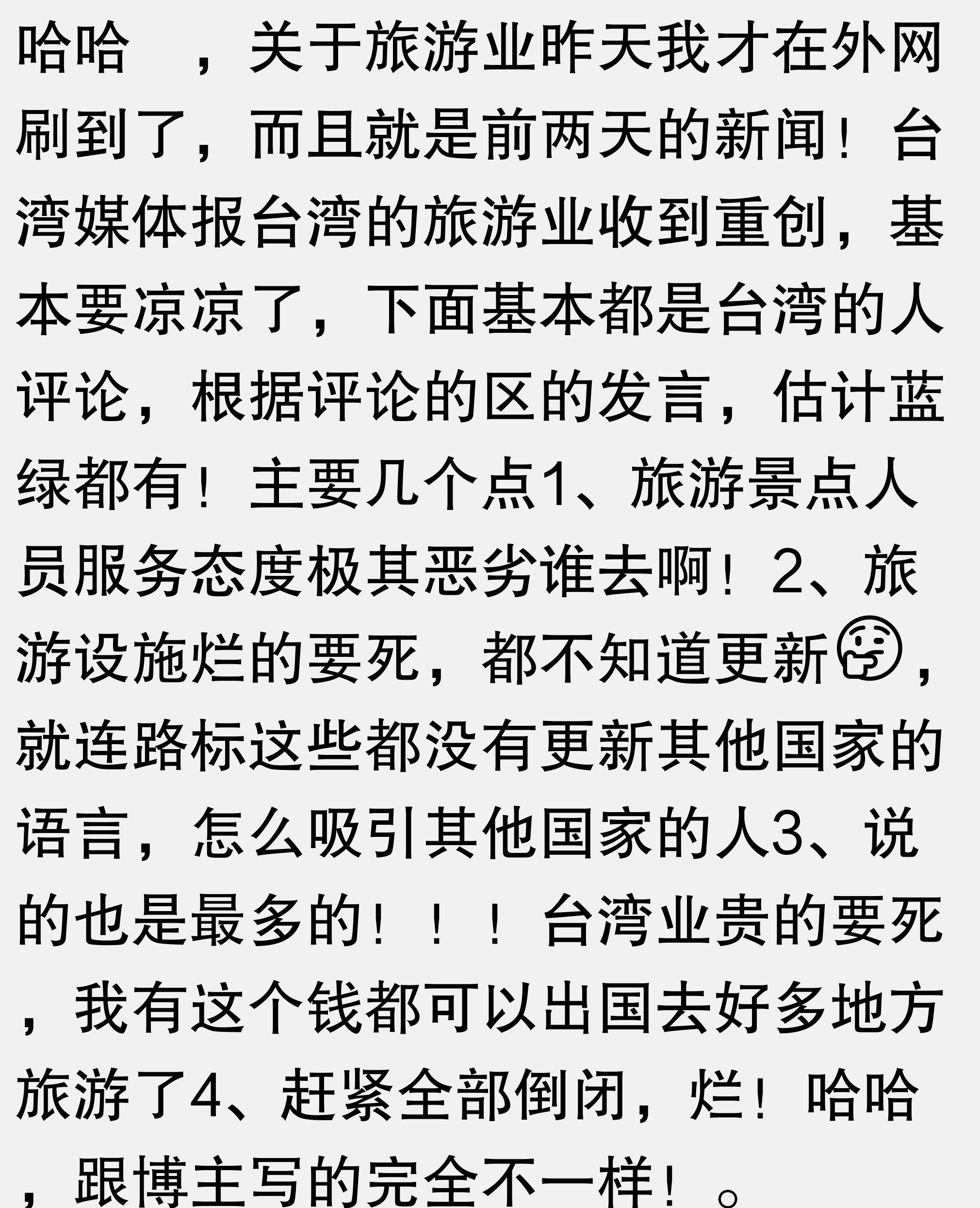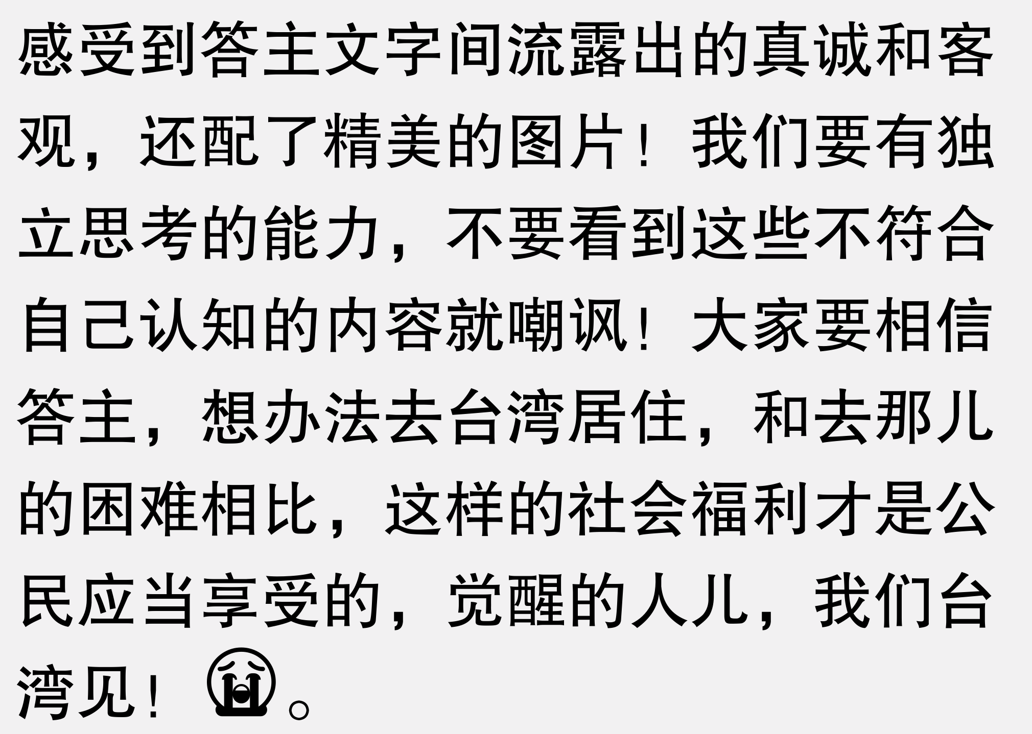 从头到尾你没说台湾什么坏话啊,只要你是赞美中国的地方我就爱听。其实我自己也很喜欢台湾,我特别希望他们能够早点接受和平统一,不至于把现在的美好生活砸烂。