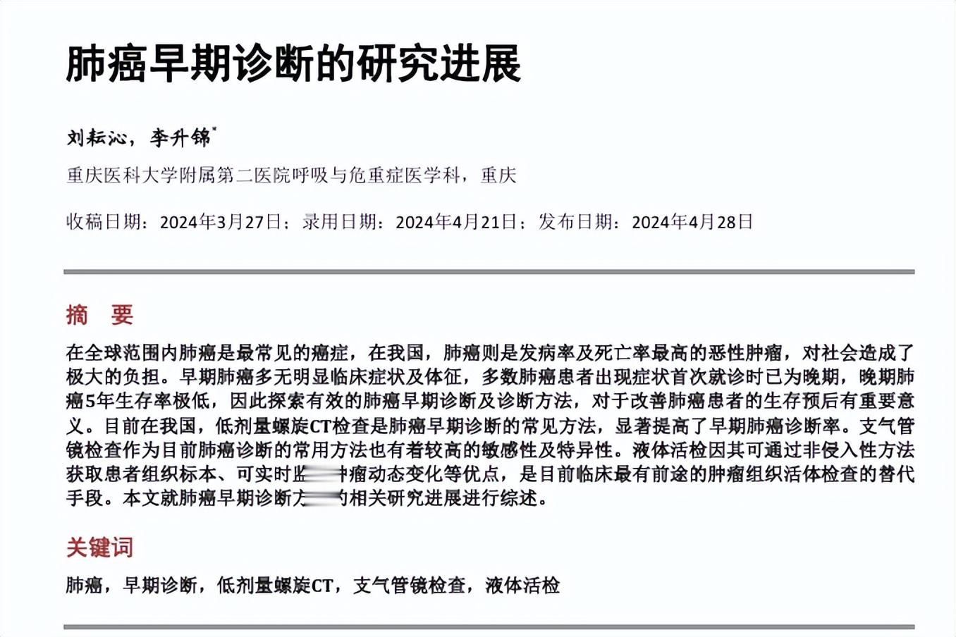参考资料[1]刘耘沁, 李升锦. 肺癌早期诊断的研究进展[J]. 临床医学进展, 2024, 14(4): 2406-2413.
