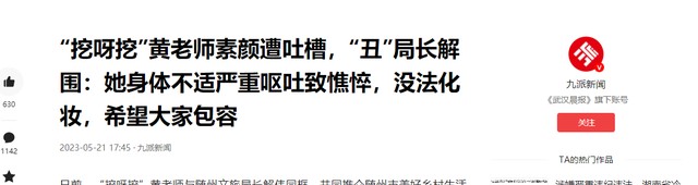 【2】九派新闻,2023-05-21,““挖呀挖”黄老师素颜遭吐槽,“丑”局长解围:她身体不适严重呕吐致憔悴,没法化妆,希望大家包容”.